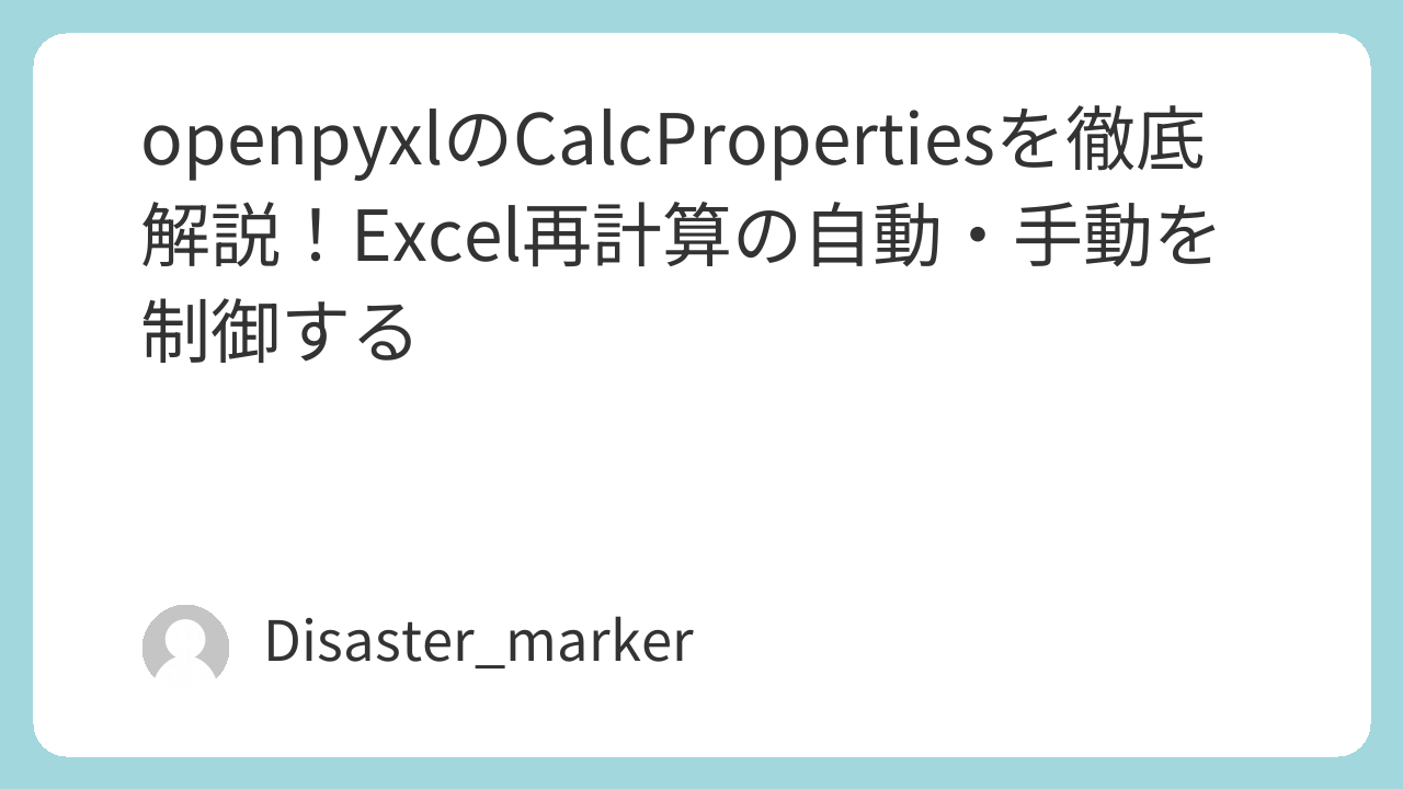 普段Excelを手で操作するときに設定する「自動」や「手動」といった計算タイミングを、openpyxlで保存するファイルにあらかじめ埋め込むことができます。これは、workbookオブジェクトのcalculation属性としてアクセスできます。