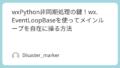 • GUIは不要だが、wxPythonのイベントシステム(例: wx.Timer)を使ってバックグラウンド処理を行いたい。