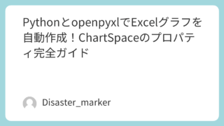openpyxl PythonとopenpyxlでExcelグラフを自動作成!ChartSpaceのプロパティ完全ガイド PythonライブラリopenpyxlでExcelグラフを自由自在にカスタマイズする方法を解説。ChartSpaceオブジェクトのtitle, legend, plotAreaなどのプロパティを使い、フォント、色、レイアウトなどをコードで設定。レポート品質のグラフ作成を自動化したい方必見のガイドです。 2025.10.02 Pythonopenpyxlグラフ関連