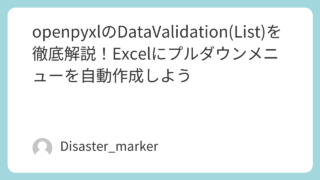 openpyxl openpyxlのDataValidation(List)を徹底解説!Excelにプルダウンメニューを自動作成しよう PythonのopenpyxlライブラリでExcelにプルダウンメニュー(ドロップダウンリスト)を自動作成する方法を徹底解説。基本コードから、メンテナンス性の高い別シート参照、便利なエラーメッセージ設定まで網羅します。 2025.09.22 Pythonopenpyxlデータ機能