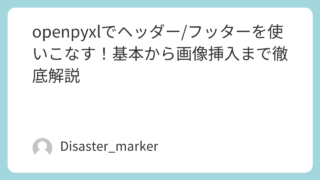 openpyxl openpyxlでヘッダー/フッターを使いこなす!基本から画像挿入まで徹底解説 PythonのopenpyxlライブラリでExcelのヘッダー・フッターを自由自在に設定する方法を徹底解説。基本のテキスト設定、ページ番号の自動挿入、そして応用として会社のロゴ画像(&G)を挿入する具体的なコードまで、初心者にも分かりやすく紹介します。 2025.09.17 Pythonopenpyxl基本構造
