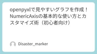 openpyxl openpyxlで見やすいグラフを作成!NumericAxisの基本的な使い方とカスタマイズ術(初心者向け) PythonのopenpyxlライブラリでExcelグラフの軸を自由にカスタマイズする方法を初心者向けに解説。NumericAxisクラスを使い、軸の最大値・最小値、目盛りの間隔、タイトル、対数スケールなどをコード例付きで具体的に説明します。 2025.10.06 Pythonopenpyxlグラフ関連