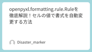 openpyxl openpyxl.formatting.rule.Ruleを徹底解説!セルの値で書式を自動変更する方法 Pythonのopenpyxlライブラリにおけるformatting.rule.Ruleクラス群の使い方を徹底解説。セルの値に応じて背景色やアイコンを自動設定する「条件付き書式」の具体的な方法を、CellIsRuleやFormulaRuleなどのコード例付きで紹介します。 2025.09.24 Pythonopenpyxlデータ機能