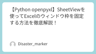 openpyxl 【Python openpyxl】SheetViewを使ってExcelのウィンドウ枠を固定する方法を徹底解説! PythonのopenpyxlライブラリでExcelのウィンドウ枠を固定する方法とは?この記事では、SheetViewクラスとfreeze_panesプロパティを使い、ヘッダー行や特定の列を固定する具体的なコード例を初心者にも分かりやすく解説します。 2025.09.17 Pythonopenpyxl基本構造