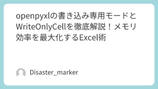 openpyxl openpyxlの書き込み専用モードとWriteOnlyCellを徹底解説!メモリ効率を最大化するExcel術 Python openpyxlで大量データ出力時のメモリ不足を解決!書き込み専用モードとWriteOnlyCellでメモリ効率を最大化し、巨大なExcelファイルを高速生成する方法をコード付きで解説します。 2025.09.18 Pythonopenpyxl基本構造