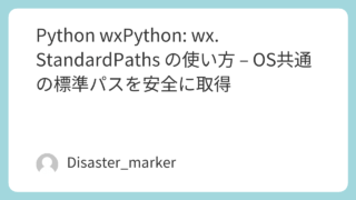 Python Python wxPython: wx.StandardPaths の使い方 – OS共通の標準パスを安全に取得 wxPythonアプリで「ドキュメント」フォルダや設定ファイルの保存場所をOS(Windows, macOS, Linux)共通で安全に取得する方法とは?wx.StandardPathsの使い方、特にGetDocumentsDirとGetUserDataDirの違いをサンプルコード付きで解説します。 2025.10.21 Pythonwxpythonアプリケーションとコアクラス
